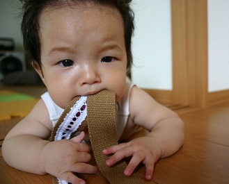 ずり這い(おなかを床につけたまま、手足の力で前進する行動)をマスターし